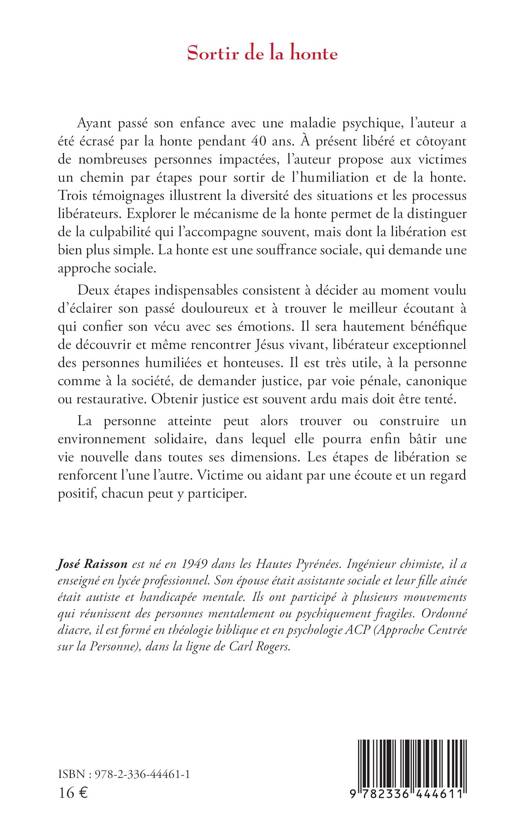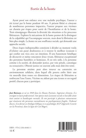 Ayant passé son enfance avec une maladie psychique, l'auteur a été écrasé par la honte pendant 40 ans. À présent libéré, l'auteur propose aux victimes un chemin par étapes pour sortir de l'humiliation et de la honte. Trois témoignages illustrent la diversité des situations et les processus libérateurs. Explorer le mécanisme de la honte permet de la distinguer de la culpabilité qui l'accompagne souvent, mais dont la libération est bien plus simple. La honte est une souffrance sociale, qui demande une approche sociale. Deux étapes indispensables consistent à décider au moment voulu d'éclairer son passé douloureux et à trouver le meilleur écoutant à qui confier son vécu avec ses émotions. Il sera hautement bénéfique de découvrir et même rencontrer Jésus vivant, libérateur exceptionnel des personnes humiliées et honteuses. Il est très utile, à la personne comme à la société, de demander justice, par voie pénale, canonique ou restaurative. Obtenir justice est souvent ardu mais doit être tenté, afin de bâtir une vie nouvelle.