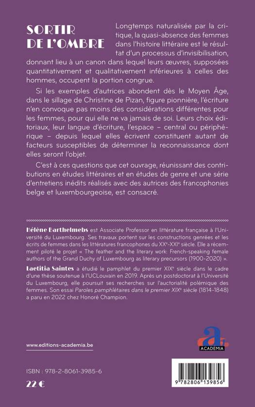 Longtemps naturalisée par la critique, la quasi-absence des femmes dans l'histoire littéraire est le résultat d'un processus d'invisibilisation, donnant lieu à un canon dans lequel leurs oeuvres, supposées quantitativement et qualitativement inférieures à celles des hommes, occupent la portion congrue. Si les exemples d'autrices abondent dès le Moyen Âge, dans le sillage de Christine de Pizan, figure pionnière, l'écriture n'en convoque pas moins des considérations différentes pour les femmes, pour qui elle ne va jamais de soi. Leurs choix éditoriaux, leur langue d'écriture, l'espace - central ou périphérique - depuis lequel elles écrivent constituent autant de facteurs susceptibles de déterminer la reconnaissance dont elles seront l'objet. C'est à ces questions que cet ouvrage, réunissant des contributions en études littéraires et en études de genre et une série d'entretiens inédits réalisés avec des autrices des francophonies belge et luxembourgeoise, est consacré.