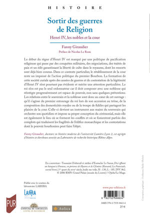 Le début du règne d’Henri IV est marqué par une politique de pacification religieuse qui passe par des conquêtes militaires, des négociations, des traités de paix et un édit garantissant la liberté de culte dans le royaume, dont les ressorts sont déjà bien connus. Dans ce contexte particulier, le rétablissement de la cour reste un impensé de l’action politique du premier Bourbon. La formation de cette société curiale après des années de guerres et de contestation de la légitimité d’Henri IV n’est pourtant pas évidente et mérite une attention particulière. Le roi n’en est pas le seul ordonnateur car il doit composer avec une noblesse qui réintègre progressivement cet espace de pouvoir, non sans quelques prétentions. Les relations entre le souverain et la noblesse sont donc au coeur de cet ouvrage : qu’il s’agisse du premier entourage du roi lors de son accession au trône, de la composition des domesticités royales ou de la troupe de fidèles qui partagent les plaisirs de la cour. Celle-ci devient un instrument aux mains du souverain qui orchestre son quotidien et impose sa propre conception du cérémonial, mais elle est également le lieu où se forment les conflits et où se fomentent parfois des complots qui traduisent les fragilités de l’édifice monarchique et les contestations dont le pouvoir bourbonien peut faire l’objet.