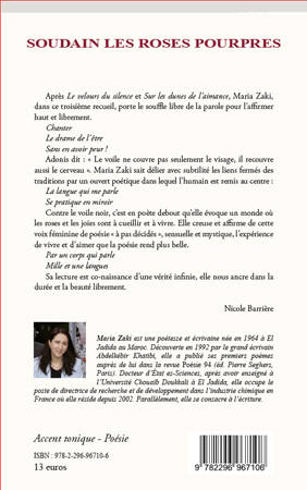 Aprés Le velours du silence et Sur les dunes de l'aimance, Maria Zaki, dans ce troisième recueil, porte le souffle libre de la parole pour l'affirmer haut et librement. Contre le voile noir, c'est en poète debout qu'elle évoque un monde où les roses et les joies sont à cueillir et à vivre. Elle creuse et affirme de cette voix féminine de poésie "à pas décidés", sensuelle et mystique, l'expérience de vivre et d'aimer que la poésie rend plus belle. Nicole Barrière