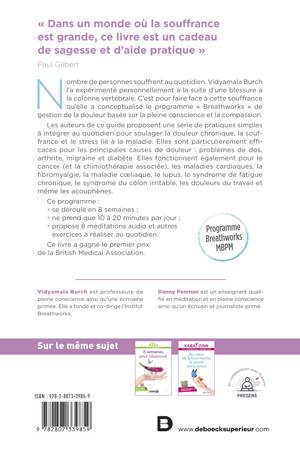 Se basant sur la pleine conscience et la compassion, les auteurs proposent une série de pratiques simples à intégrer au quotidien pour soulager la douleur chronique, la souffrance et le stress lié à la maladie. En effet, le plus souvent, la douleur s’impose à nous. La souffrance, par contre, peut-être apaisée voire même disparaître.