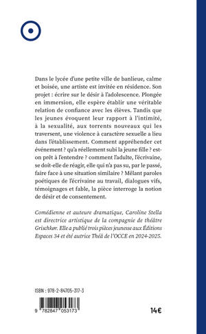 Dans le lycée d'une petite ville de banlieue, calme et boisée, une artiste est invitée en résidence. Son projet : écrire sur le désir à l'adolescence. Plongée en immersion, elle espère établir une véritable relation de confiance avec les élèves. Tandis que les jeunes évoquent leur rapport à l'intimité, à la sexualité, aux torrents nouveaux qui les traversent, une violence à caractère sexuelle a lieu dans l'établissement. Comment appréhender cet événement ? qu'a réellement subi la jeune fille ? est-on prêt à l'entendre ? comment l'adulte, l'écrivaine, se doit-elle de réagir, elle qui n'a pas su, par le passé, faire face à une situation similaire ? Mêlant paroles poétiques de l'écrivaine au travail, dialogues vifs, témoignages et fable, la pièce interroge la notion de désir et de consentement.