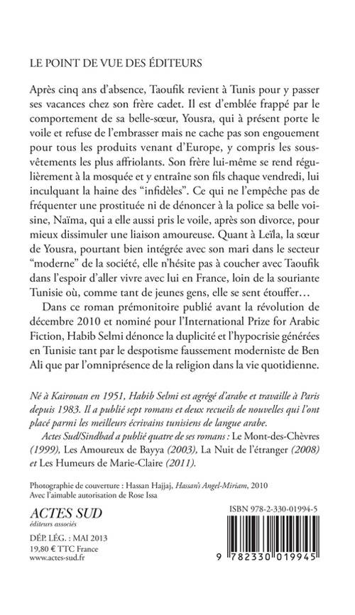 Dans ce roman prémonitoire publié avant la révolution de décembre 2010 et nominé pour l'International Prize for Arabic Fiction, Habib Selmi dénonce la duplicité et l'hypocrisie générées en Tunisie tant par le despotisme faussement moderniste de Ben Ali que par l'omniprésence de la religion dans la vie quotidienne.