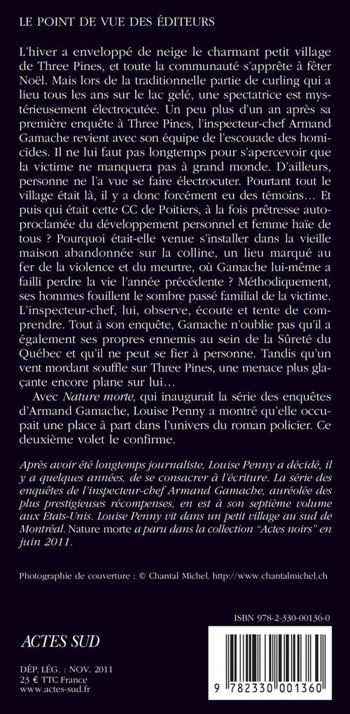 Lorsque l'inspecteur Armand Gamache est chargé d'enquêter sur un nouveau meurtre survenu au sein de la petite communauté de Three Pines, il ne lui faut pas longtemps pour comprendre que la victime ne manquera à personne. D'ailleurs, personne ne l'a vue se faire électrocuter en plein milieu d'un lac gelé lors d'une compétition de curling. Pourtant, il y a forcément eu des témoins... Un deuxième roman qui confirme que Louise Penny est l'héritière naturelle d'Agatha Christie.