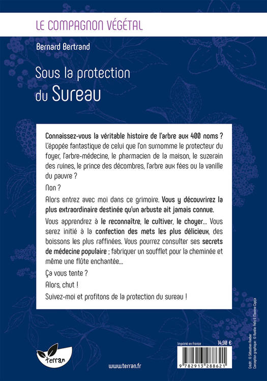 Connaissez-vous la véritable histoire de l’arbre aux 400 noms ? L’épopée fantastique de celui que l’on surnomme le protecteur du foyer, l’arbre-médecine, le pharmacien de la maison, le suzerain des ruines, le prince des décombres, l’arbre aux fées ou la vanille du pauvre ? Non ? Alors entrez avec moi dans ce grimoire. Vous y découvrirez la plus extraordinaire destinée qu’un arbuste ait jamais connue. Vous apprendrez à le reconnaître, le cultiver, le choyer… Vous serez initié à la confection des mets les plus délicieux, des boissons les plus raffinées. Vous pourrez consulter ses secrets de médecine populaire ; fabriquer un soufflet pour la cheminée et même une flûte enchantée… Ça vous tente ? Alors, chut ! Suivez-moi et profitons de la protection du sureau !