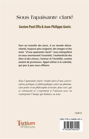 Face au tumulte des jours, à un monde désenchanté, toujours plus exigeant, des images et des mots “d'une apaisante clarté” nous interpellent en nous murmurant l'essentiel, l'authenticité des êtres et des choses, l'amour et l'humilité, comme autant de promesses. Appel ultime à la sobriété, qui peu à peu nous effleure. Sous l’apaisante clarté résulte alors d’une conversation poétique et philosophique entre un pharmacien-poète et un philosophe-écrivain, deux voix qui se retrouvent et s’expriment à l’unisson avec en contrepoint l’image qui balance sa note.