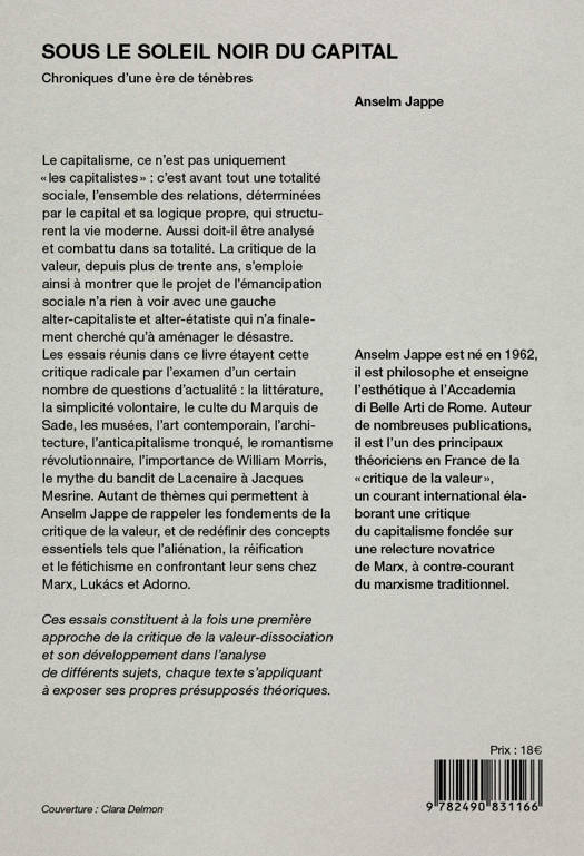 Le capitalisme, ce n'est pas seulement « les capitalistes ». C'est surtout le capital, la logique du capital, en tant que totalité sociale, ensemble des relations qui structurent la vie moderne. Les essais réunis dans ce livre, examinent des thèmes apparemment disparates mais qui relèvent d'une même critique radicale du capital : la littérature, le mythe du bandit, la simplicité volontaire, le culte de Sade, les musées et l'art contemporain, l'architecture, l'anticapitalisme tronqué, le romantisme révolutionnaire et l'importance de William Morris. C'est l'occasion pour l'auteur de reprendre fondements de la critique de la valeur-dissociation, comme les concepts d'aliénation, de réification et de fétichisme. Le présent volume réunit les récents travaux de recherche menés par Anselm Jappe. Ils constituent à la fois une première approche de la critique de la valeur-dissociation et son application à différents objets, chaque texte s'appliquant à exposer ses propres présupposés théoriques.
