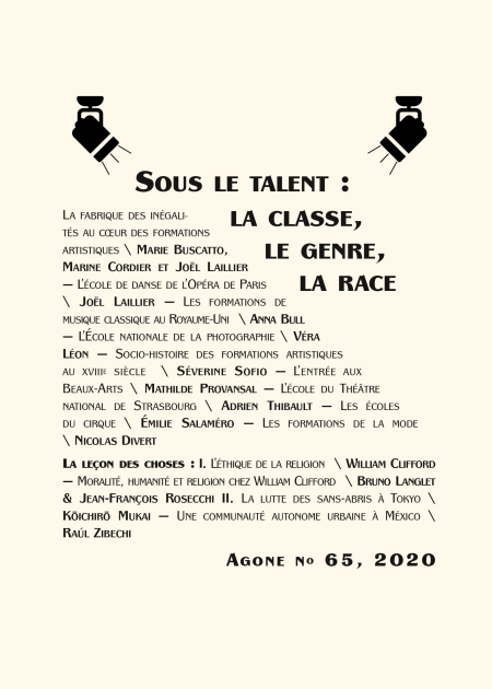 Une vision courante de ces écoles est ainsi qu'elles se contentent de faire éclore les « talents » qu'elles repèrent, nourrissent et accompagnent. Prenant le contre-pied de cette conception individuelle de la réussite, ce volume montre que la classe sociale, le genre ou la « race » sont décisifs à l’entrée dans les formations comme au fil de la scolarité ou à sa sortie. À travers l'étude de multiples arts — cirque, théâtre, arts visuels, mode, musique et photographie — sont montrées les différentes manières dont les formations artistiques participent à la construction invisible et « naturelle » de ces inégalités qui se répercutent ensuite en profondeur dans les univers artistiques eux-mêmes.