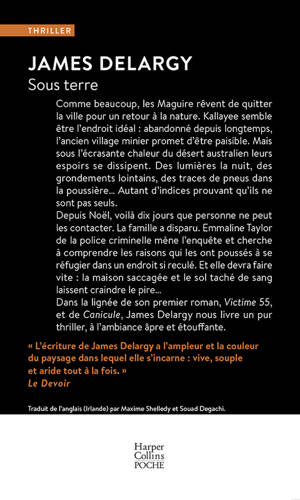 Comme beaucoup, les Maguire rêvent de quitter la ville pour un retour à la nature. Kallayee semble être l’endroit idéal : abandonné depuis longtemps, l’ancien village minier promet d’être paisible. Mais sous l’écrasante chaleur du désert australien leurs espoirs se dissipent. Des lumières la nuit, des grondements lointains, des traces de pneus dans la poussière… Autant d’indices prouvant qu’ils ne sont pas seuls. Depuis Noël, voilà dix jours que personne ne peut les contacter. La famille a disparu. Emmaline Taylor de la police criminelle mène l’enquête et cherche à comprendre les raisons qui les ont poussés à se réfugier dans un endroit si reculé. Et elle devra faire vite : la maison saccagée et le sol taché de sang laissent craindre le pire… Dans la lignée de son premier roman, Victime 55, et de Canicule, James Delargy nous livre un pur thriller, à l’ambiance âpre et étouffante. Traduit de l’anglais (Irlande) par Maxime Shelledy et Souad Degachi.
