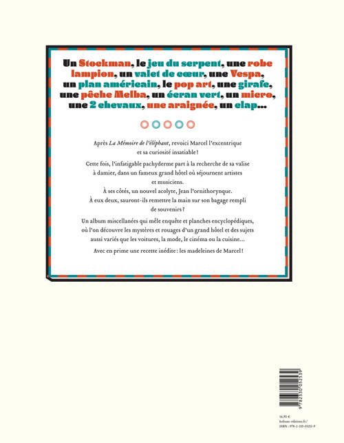 Cette fois, l'infatigable pachyderme part à la recherche de sa valise à damiers, dans un fameux grand hôtel où séjournent artistes et musiciens.