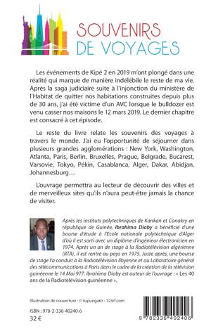 Les événements de Kipé 2 en 2019 m ont plongé dans une réalité qui marque de manière indélébile le reste de ma vie. Après la saga judiciaire suite à l injonction du ministère de l Habitat de quitter nos habitations construites depuis plus de 30 ans, j ai été victime d un AVC lorsque le bulldozer est venu casser nos maisons le 12 mars 2019. Le dernier chapitre est consacré à cet épisode. Le reste du livre relate les souvenirs des voyages à travers le monde. J ai eu l opportunité de séjourner dans plusieurs grandes agglomérations: New York, Washington, Atlanta, Paris, Berlin, Bruxelles, Prague, Belgrade, Bucarest, Varsovie, Tokyo, Pékin, Casablanca, Alger, Dakar, Abidjan, Johannesburg L ouvrage permettra au lecteur de découvrir des villes et de merveilleux sites qu ils n aura peut-être jamais la chance de visiter.