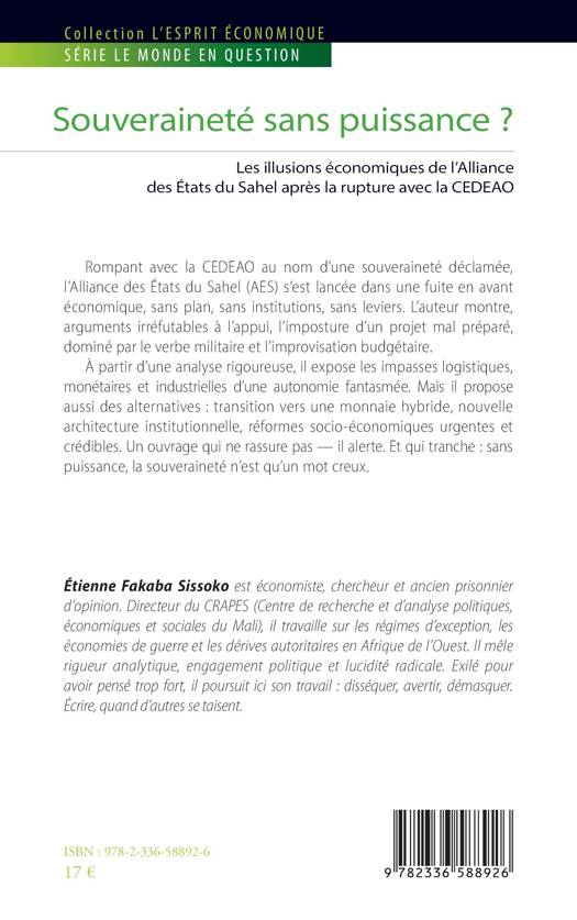 Rompant avec la CEDEAO au nom d’une souveraineté déclamée, l’Alliance des États du Sahel (AES) s’est lancée dans une fuite en avant économique, sans plan, sans institutions, sans leviers. L’auteur montre, arguments irréfutables à l’appui, l’imposture d’un projet mal préparé, dominé par le verbe militaire et l’improvisation budgétaire. À partir d’une analyse rigoureuse, il expose les impasses logistiques, monétaires et industrielles d’une autonomie fantasmée. Mais il propose aussi des alternatives : transition vers une monnaie hybride, nouvelle architecture institutionnelle, réformes socio-économiques urgentes et crédibles. Un ouvrage qui ne rassure pas — il alerte. Et qui tranche : sans puissance, la souveraineté n’est qu’un mot creux.