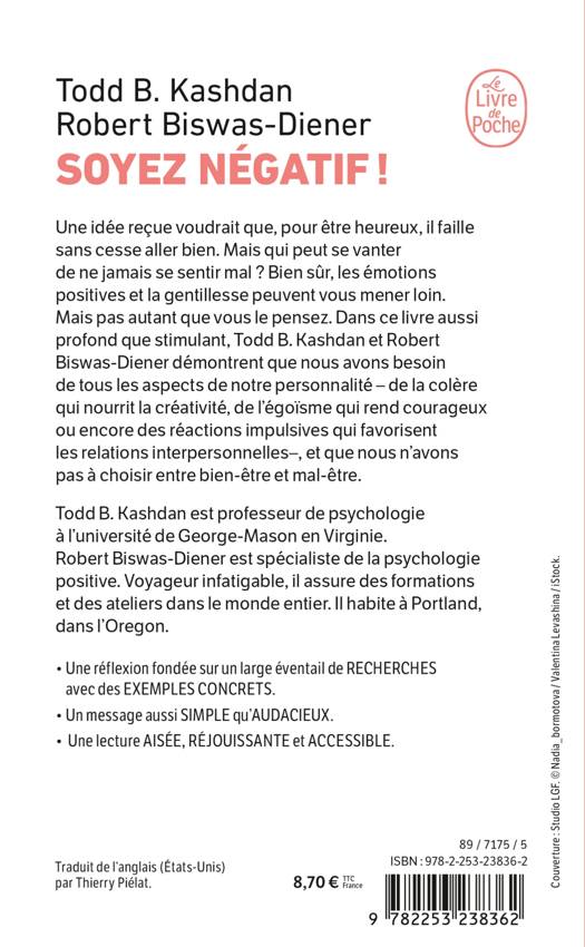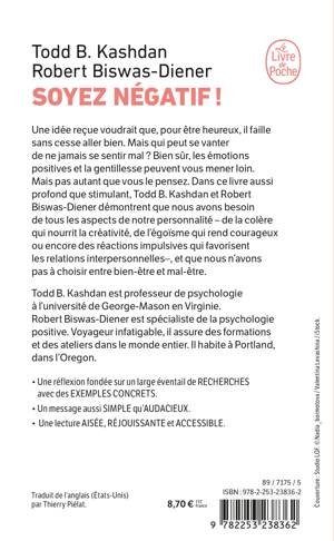 Une idée reçue voudrait que, pour être heureux, il faille sans cesse se sentir bien. Mais qui peut se vanter de ne jamais se sentir mal ? Bien sûr, les émotions positives et la gentillesse peuvent vous mener loin. Mais pas aussi loin que vous le pensez. Dans ce livre aussi profond que stimulant, Todd Kashdan et Robert Biswas-Diener démontrent que nous avons besoin de tous les aspects de notre personnalité : de la colère qui nourrit la créativité, de l’égoïsme qui rend courageux ou encore des réactions impulsives qui favorisent les relations interpersonnelles…, et que nous n’avons pas à choisir entre bien-être et mal-être.