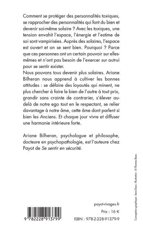Comment se protéger des personnalités toxiques, se rapprocher des personnalités qui font du bien et devenir soi-même solaire ? Auprès des toxiques, une tension envahit l'espace, notre énergie et notre estime de soi sont vampirisées. Auprès des solaires, l'espace est ouvert et on se sent bien. Pourquoi ? Parce que ces personnes ont un certain pouvoir sur elles-mêmes et n'ont pas besoin de l'exercer sur autrui pour se sentir exister.