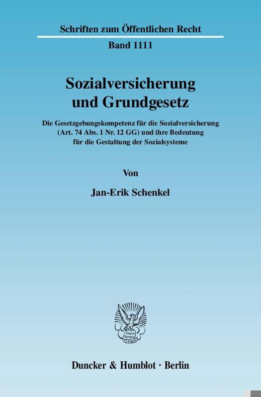 Die Sozialversicherung bildet das Rückgrat des deutschen Sozialstaates. Ungeachtet dessen wird sie im Grundgesetz nur an wenigen Stellen ausdrücklich erwähnt. Als "Leitvorschrift" gilt die konkurrierende Gesetzgebungszuständigkeit aus Art. 74 Abs. 1 Nr. 12 GG. Vor dem Hintergrund der fortwährenden sozialpolitischen Reformdiskussion untersucht Jan-Erik Schenkel die Bedeutung dieser Regelung für die Gestaltung des Sozialversicherungsrechts. Wie ist die Kompetenz aus Art. 74 Abs. 1 Nr. 12 GG von anderen Gesetzgebungszuständigkeiten abzugrenzen? Regelt die Vorschrift auch materielle Vorgaben für die Tätigkeit des Gesetzgebers? Trifft sie Aussagen über die Rechtfertigung von Grundrechtseingriffen?