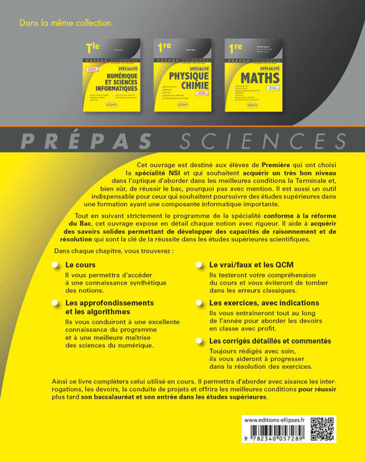Cet ouvrage est destiné aux élèves de Première qui ont choisi la spécialité NSI et qui souhaitent acquérir un très bon niveau dans l'optique d'aborder dans les meilleures conditions la Terminale et, bien sûr, de réussir le bac, pourquoi pas avec mention. Il est aussi un outil indispensable pour ceux qui souhaitent poursuivre des études supérieures dans une formation ayant une composante informatique importante.