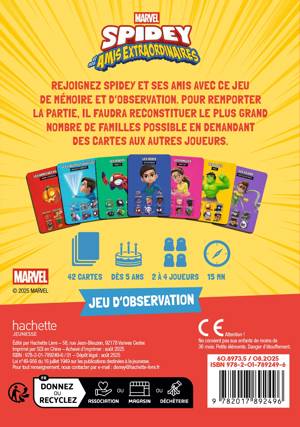 Le jeu : Un jeu de sept familles dans lequel il faut reconstituer les plus célèbres familles de l’univers Spidey et ses amis extraordinaires.