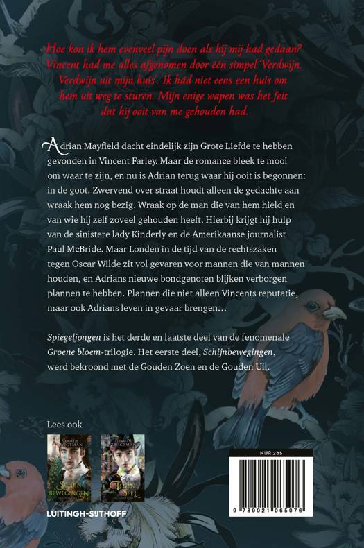 Spiegeljongen is na Schijnbewegingen en Tegenspel het derde en laatste deel van Floortje Zwigtmans indrukwekkende Groene bloem-trilogie. Deze fenomenale serie over de jonge homoseksueel Adrian Mayfield speelt zich af in victoriaans Londen. Zwigtmans Groene bloem-trilogie kan worden gerekend tot het beste wat Nederlandse young adultliteratuur te bieden heeft en is eigenlijk verplichte kost voor iedereen die zich wil verdiepen in de tijd van Oscar Wilde.