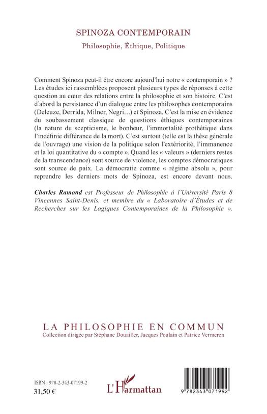 Comment Spinoza peut-il être encore aujourd’hui notre « contemporain » ? Ces études proposent plusieurs types de réponses à cette question au cœur des relations entre la philosophie et son histoire. C’est d’abord la persistance d’un dialogue entre les philosophes contemporains et Spinoza. C’est surtout une vision de la politique selon l’extériorité, l’immanence et la loi quantitative du « compte ». La démocratie comme « régime absolu » (Spinoza) est encore devant nous.