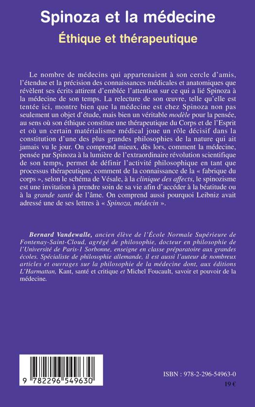 La médecine est chez Spinoza un véritable modèle pour la pensée : son éthique constitue une thérapeutique du Corps et de l'Esprit, et le matérialisme médical joue un rôle décisif dans la constitution de sa philosophie de la nature. On comprend mieux alors comment la médecine permet de définir l'activité philosophique en tant que processus thérapeutique et comment le spinozisme est une invitation à prendre soin de sa vie afin d'accéder à la béatitude ou à la grande santé de l'âme.