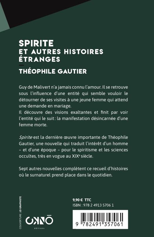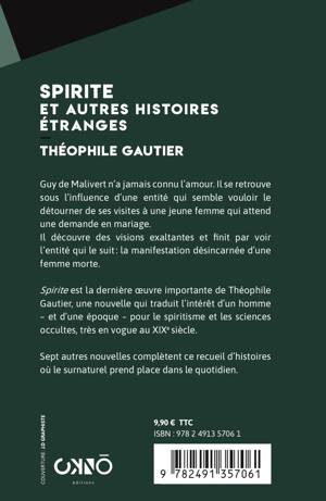 Guy de Malivert n'a jamais connu l'amour. Il se retrouve sous l'influence d'une entité qui semble vouloir le détourner de ses visites à une jeune femme qui attend une demande en mariage. Il découvre des visions exaltantes et finit par voir l'entité qui le suit : la manifestation désincarnée d'une femme morte. Spirite est la dernière oeuvre importante de Théophile Gautier, une nouvelle qui traduit l'intérêt d'un homme - et d'une époque - pour le spiritisme et les sciences occultes, très en vogue au XIXème siècle. Neuf autres nouvelles complètent ce recueil d'histoires où le surnaturel prend place dans le quotidien.