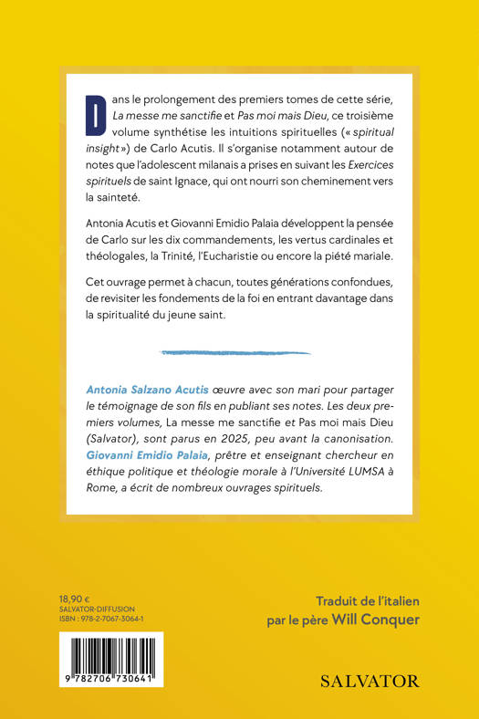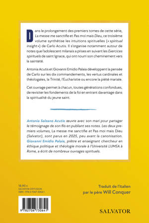 Dans le prolongement des premiers tomes de cette série, La messe me sanctifie et Pas moi mais Dieu, ce troisième volume synthétise les intuitions spirituelles (« spiritual insight ») de Carlo Acutis. Il s'organise notamment autour de notes que l'adolescent milanais a prises en suivant les Exercices spirituels de saint Ignace, qui ont nourri son cheminement vers la sainteté. Antonia Acutis et Giovanni Emidio Palaia développent la pensée de Carlo sur les dix commandements, les vertus cardinales et théologales, la Trinité, l'Eucharistie ou encore la piété mariale. Cet ouvrage permet à chacun, toutes générations confondues, de revisiter les fondements de la foi en entrant davantage dans la spiritualité du jeune saint. Antonia Salzano Acutis Åuvre avec son mari pour partager le témoignage de son fils en publiant ses notes. Les deux premiers volumes, La messe me sanctifie et Pas moi mais Dieu (Salvator), sont parus en 2025, peu avant la canonisation.