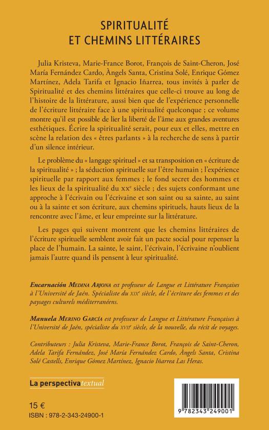 Julia Kristeva, Marie-France Borot, François de Saint-Cheron, José María Fernández Cardo, Àngels Santa, Cristina Solé, Enrique Gómez Martínez, Adela Tarifa et Ignacio Iñarrea, tous invités à parler de Spiritualité et des chemins littéraires que celle-ci trouve au long de l'histoire de la littérature, aussi bien que de l'expérience personnelle de l'écriture littéraire face à une spiritualité quelconque ; ce volume montre qu'il est possible de lier la liberté de l'âme aux grandes aventures esthétiques. Écrire la spiritualité serait, pour eux et elles, mettre en scène la relation des « êtres parlants » à la recherche de sens à partir d'un silence intérieur. Les pages qui suivent montrent que les chemins littéraires de l'écriture spirituelle semblent avoir fait un pacte social pour repenser la place de l'humain. La sainte, le saint, l'écrivain, l'écrivaine n'oublient jamais l'autre quand ils pensent à leur spiritualité.