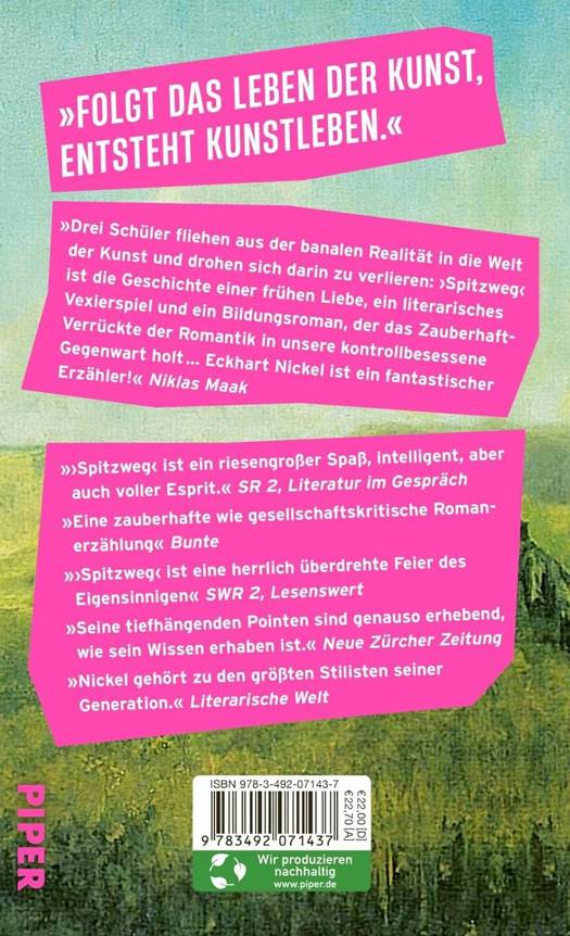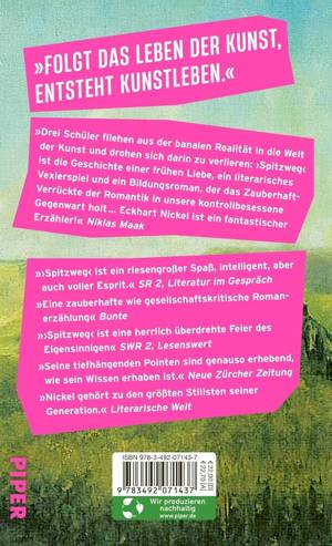 »Drei Schüler fliehen aus der banalen Realität in die Welt der Kunst und drohen sich darin zu verlieren: 'Spitzweg' ist die Geschichte einer frühen Liebe, ein literarisches Vexierspiel und ein Bildungsroman, der das Zauberhaft-Verrückte der Romantik in unsere kontrollbesessene Gegenwart holt ... Eckhart Nickel ist ein fantastischer Erzähler! « Niklas Maak