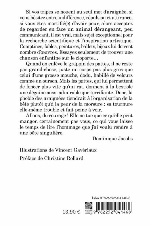 Si vos tripes se nouent au seul mot d'araignee, si vous hesitez entre indifference, repulsion et attirance, si vous etes mortifie(e) d'avoir peur, alors acceptez de regarder en face un animal derangeant, peu communicant, il est vrai, mais sujet exceptionnel pour la recherche scientifique et l'inspiration artistique. Comptines, fables, peintures, ballets, bijoux lui doivent nombre d'oeuvres. Essayez seulement de trouver une chanson enfantine sur le cloporte... Quand on enleve le grappin des pattes, il ne reste pas grand-chose, juste un corps pas plus gros que celui d'une grosse mouche, dodu, habille de velours comme un ourson. Mais les pattes, qui lui permettent de foncer plus vite qu'un rat, donnent a la bestiole une degaine aussi admirable que terrifiante. Donc, la phobie des araignees tiendrait a l'organisation de la bete plutot qu'a la peur de la morsure: sa tournure elle-meme trouble et fait peine a voir. Allons, du courage ! Elle ne tue que ce qu'elle peut manger, certainement pas vous, ce qui vous laisse le temps de lire l'hommage que j'ai voulu rendre a une bete singuliere. Dominique Jacobs