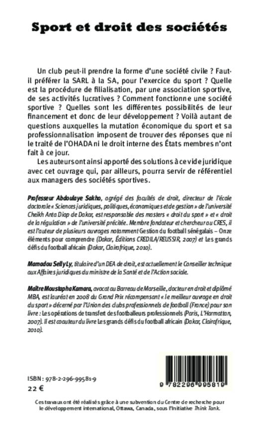 Un club peut-il prendre la forme d'une société civile ? Faut-il préférer la SARL à la SA, pour l'exercice du sport ? Comment fonctionne une société sportive ? Quelles sont les différentes possibilités de leur financement et donc de leur développement ? Les auteurs apportent des réponses à ce vide juridique dû à la mutation économique du sport et à sa professionnalisation, que ni le traité OHADA ni le droit interne des Etats membres n'ont fait à ce jour.