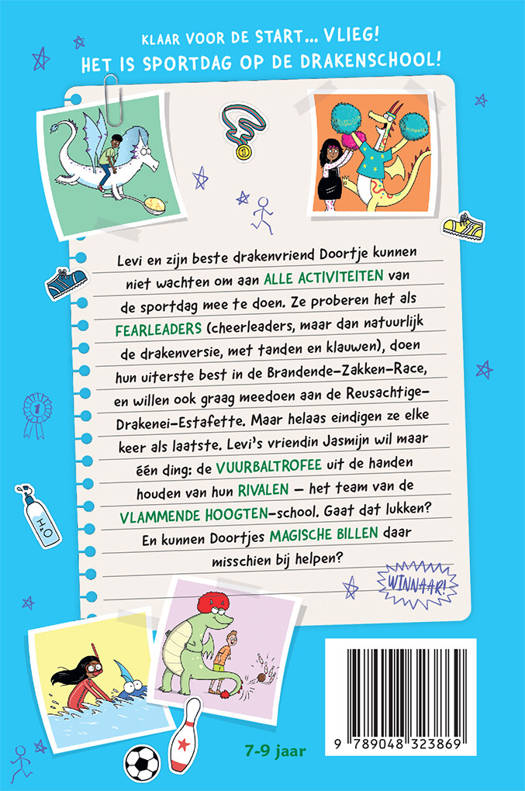 Levi en zijn beste drakenvriend Doortje kunnen niet wachten om aan ALLE ACTIVITEITEN van de sportdag mee te doen. Ze proberen het als FEARLEADERS (cheerleaders, maar dan natuurlijk de drakenversie, met tanden en klauwen), doen hun uiterste best in de Brandende-Zakken-Race, en willen ook graag meedoen aan de Reusachtige- Drakenei-Estafette. Maar helaas eindigen ze elke keer als laatste. Levi’s vriendin Jasmijn wil maar één ding: de VUURBALTROFEE uit de handen houden van hun RIVALEN – het team van de VLAMMENDE HOOGTEN-school. Gaat dat lukken? En kunnen Doortjes MAGISCHE BILLEN daar misschien bij helpen?