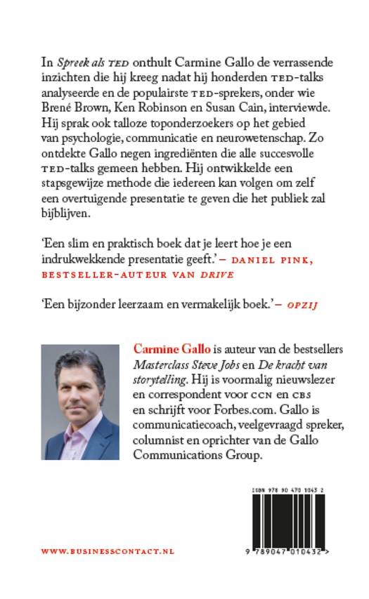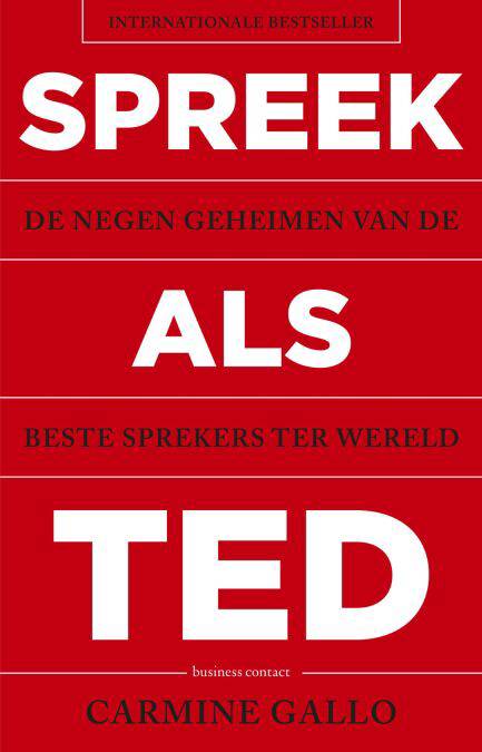 Communicatiecoach en bestsellerauteur Carmine Gallo analyseerde honderden TED-talks en interviewde de populairste TED-sprekers, onder wie Brené Brown, Ken Robinson en Susan Cain. Hij sprak talloze toponderzoekers op het gebied van psychologie, communicatie en neurowetenschap. Uit al die gesprekken kwamen verrassende inzichten naar voren en Gallo ontdekte negen ingrediënten die alle succesvolle TED-presentaties gemeen hebben. Hij ontwikkelde een stapsgewijze methode die iedereen kan volgen om zelf een overtuigende presentatie te geven die het publiek zal bijblijven. En dat is in de 21ste eeuw een onmisbare vaardigheid die je in staat zal stellen je doelen te verwezenlijken.