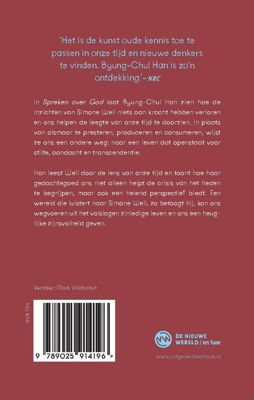 Byung-Chul Han laat in dit indringende essay zien hoe actueel het denken van Simone Weil is. Haar spirituele kracht en radicale kritiek op productie, prestatie en consumptie bieden een helend perspectief op deze tijd. Weil wijst ons een andere weg: naar een leven dat openstaat voor transcendentie, stilte en zin. Volgens Han zou de wereld mooier en vreedzamer zijn als we leefden zoals Weil het voorleefde – vol aandacht, overgave en innerlijke waarheid. Over eerder werk: 'Tegenwoordig sjouw ik dit boek overal met me mee, duw het vrienden en wildvreemden onder hun neus en blijf er maar over praten, wat er zo mooi, zo bijzonder, zo slim en warm en liefdevol aan is.' – Marian Donner in De Groene Amsterdammer
