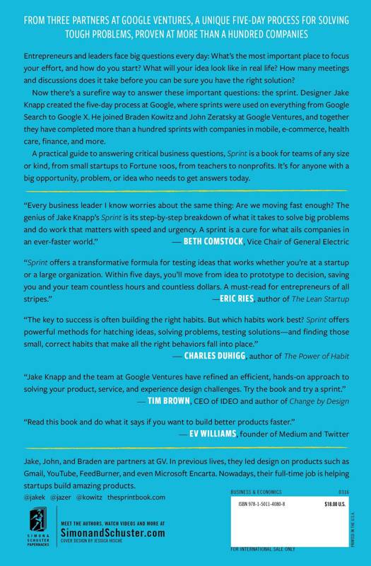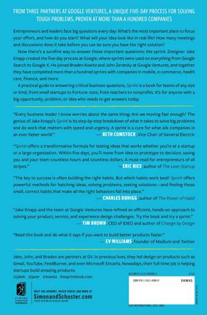 A practical guide to answering critical business questions, Sprint is a book for teams of any size, from small startups to Fortune 100s, from teachers to nonprofits. It can replace the old office defaults with a smarter, more respectful, and more effective way of solving problems that brings out the best contributions of everyone on the team—and helps you spend your time on work that really matters.