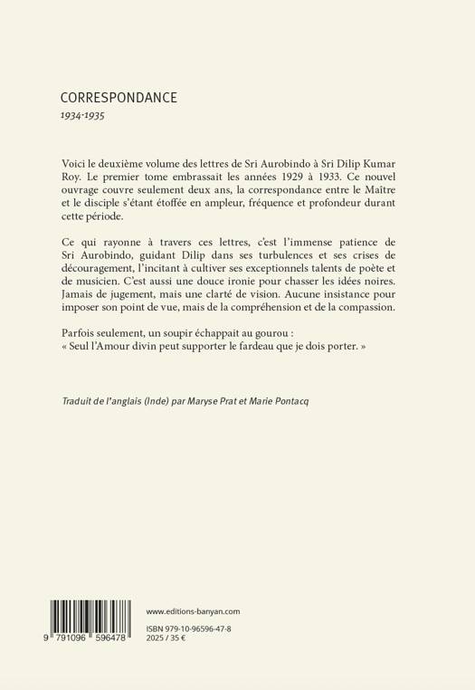 Voici le deuxième volume des lettres de Sri Aurobindo à Dilip Kumar Roy. Le premier tome embrassait les années 1929 à 1933. Ce nouvel ouvrage couvre seulement deux ans, la correspondance entre le Maître et le disciple s’étant étoffée en ampleur, fréquence et profondeur durant cette période.