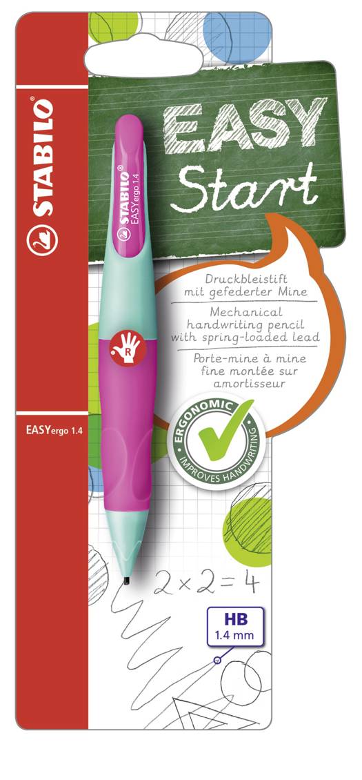 Porte-mine d'apprentissage STABILO EASYergo 1.4, couleur rose, pour droitiers Particulièrement adapté aux enfants de 8 ans et plus, ce porte-mine existe en version droitier et gaucher pour une prise en main optimale. La mine montée sur amortisseur assure souplesse et confort d'écriture même après une longue journée d'école. Le diamètre de la mine est de 1,4 mm et ne nécessite pas d'être taillée. Espace prévu pour inscrire le nom Fabriqué en Europe