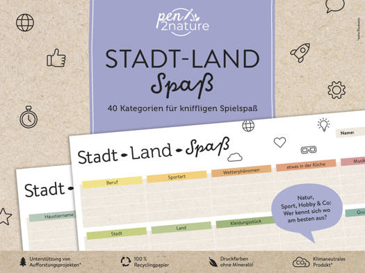 In dieser Variante von Stadt-Land-Fluss findest du jede Menge Kategorien, die deine Synapsen zum Glühen bringen. Ob Sport, Hobby, Natur, Alltag, Ernährung oder Umwelt: hier hat jede und jeder was zum Grübeln. Damit aus Denksport Denkspaß wird, dürfen witzige Kategorien zum Auflockern natürlich nicht fehlen. Die überraschende Mischung aus Wissen, Spaß und Schnelligkeit sind die kurzweilige Antwort auf lange Zugfahrten oder heimelige Abende auf der Couch.