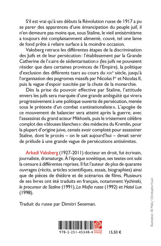 Vaksberg retrace les différentes étapes de la discrimination des Juifs et de leur persécution : l’établissement par la Grande Catherine de l’« aire de sédentarisation » (les juifs ne pouvaient résider que dans certaines provinces de l’Empire), la politique d’exclusion des différents tsars au cours du XIXe siècle, jusqu’à l’organisation des pogromes massifs par Nicolas Ier et Nicolas II, puis la vague d’espoir suscitée par la chute de la monarchie.