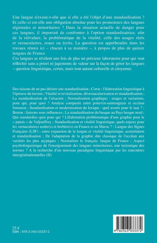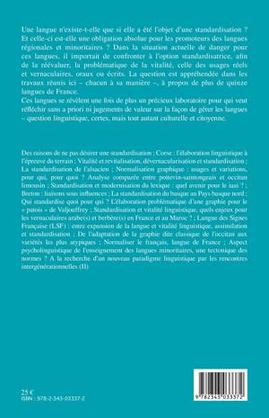 Une langue n'existe-t-elle que si elle a été l'objet d'une standardisation ? Et celle-ci est-elle une obligation absolue pour les promoteurs des langues régionales et minoritaires ? Dans la situation actuelle de danger pour ces langues, il importait de confronter à l'option standardisatrice, afin de la réévaluer, la problématique de la vitalité, celle des usages réels et vernaculaires, oraux ou écrits. La question est appréhendée dans les travaux réunis ici-chacun à sa manière-, à propos de plus de quinze langues de France.