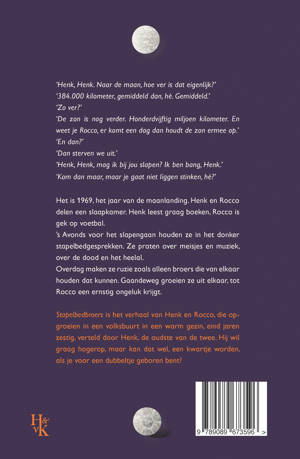 Het is 1969, het jaar van de maanlanding. Henk en Rocco delen een slaapkamer. Henk leest graag boeken, Rocco is gek op voetbal. ’s Avonds voor het slapen gaan houden ze in het donker stapelbedgesprekken. Ze praten over meisjes en muziek, over de dood en het heelal. Overdag maken ze ruzie zoals alleen broers die van elkaar houden dat kunnen. Gaandeweg groeien ze uit elkaar, tot Rocco een ernstig ongeluk krijgt. 'Stapelbedbroers' is het verhaal van Henk en Rocco, die opgroeien in een volksbuurt in een warm gezin, eind jaren zestig, verteld door Henk, de oudste van de twee. Hij wil graag hogerop, maar kan dat wel, een kwartje worden, als je voor een dubbeltje geboren bent?