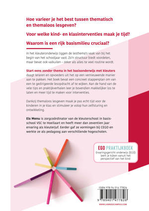 Start eens zonder thema in het basisonderwijs met kleuters daagt leraren en opvoeders uit het op een vernieuwende manier aan te pakken. Het boek bevat een concreet stappenplan om van een te gedirigeerde lesopdracht af te wijken. Aan de hand van de vele tips en praktijkverhalen leer je bovendien makkelijker los te laten en meer tijd te maken voor interventies.