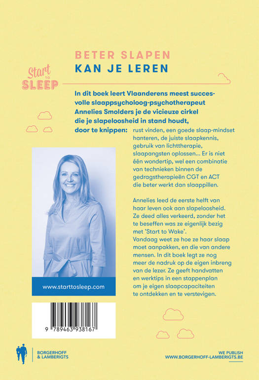 Beter slapen kun je leren. Je kunt leren controle te krijgen over je slaap. In dit boek leert Vlaanderens meest succesvolle slaaptherapeute Annelies Smolders je stap na stap de vicieuze cirkel, die je slapeloosheid in stand houdt, door te knippen: rust vinden, een goede slaap-mindset hanteren, de juiste slaapkennis, gebruik van lichttherapie, slaapangsten oplossen ... Er is niet één wondertip, wel een combinatie van technieken en methoden.