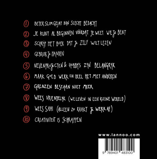 Volg je interesses, waar ze je ook naartoe leiden. Vroeg of laat wordt die hobby misschien wel je levenswerk. Vergeet het cliché dat je moet schrijven over wat je al weet. Schrijf in de plaats daarvan het boek dat je wilt lezen, maak de film die je wilt zien. En bovenal: wees steeds vriendelijk, blijf uit de schulden en durf af en toe saai te zijn. Want alleen dan zul je voor jezelf ruimte creëren om grenzen te verleggen.