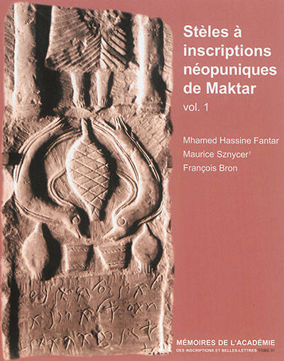 Ce volume publie avec le soutien de la Leon Levy Foundation (New York) et de l'Union academique internationale (UAI) comprend la publication de 97 steles neopuniques inscrites provenant de Maktar, trouvees en diverses occasions entre 1887 et la fin du mandat francais en Tunisie. Leur etude par Mhamed Hassine Fantar et Maurice Sznycer a ete menee a terme par Francois Bron. Certaines sont funeraires; d'autres, votives, proviennent du tophet ou du temple de Hoter Miskar. Les steles sont decrites, et toutes les inscriptions sont transcrites, traduites et commentees. Le volume comprend egalement une etude iconographique par Colette Picard. Ces documents jettent une lumiere interessante sur la culture punique en milieu numide dans les siecles qui ont suivi la destruction de Carthage. Ce premier tome sera suivi d'un deuxieme qui comprendra le lot des steles trouvees lors des fouilles tunisiennes en 1969 dans le soubassement de l'arc romain.