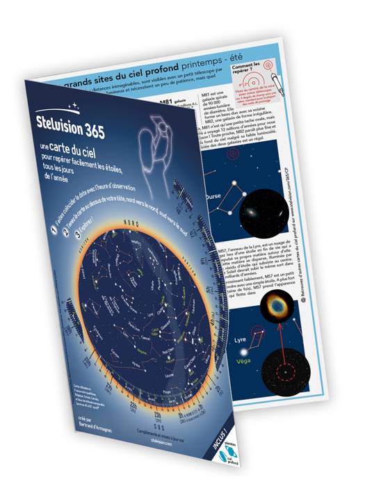 C'est un guide de base pour explorer facilement le ciel : sous un format pratique (dépliant cartonné double-A4), la carte-guide du ciel Stelvision 365 comprend une carte générale du ciel et trois pages de guide vers les principales merveilles célestes.