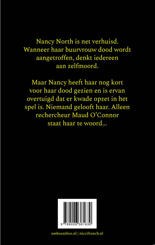 Nancy North en haar vriend Felix zijn net in een goedkoop appartement in West-Londen getrokken, dat Felix heeft gevonden terwijl zij ziek was. Ze heeft een psychose gehad, maar nu is ze er weer bovenop. Ook al is de woning wat vervallen en ligt die aan de verkeerde kant van de stad, de verhuizing betekent voor Nancy een nieuwe start. Toch heeft Nancy al vanaf de eerste dag geen goed gevoel over de plek en over enkele andere bewoners van het pand, en ze merkt dat dat een weerslag op haar stemming heeft. Wanneer haar buurvrouw Kira dood wordt aangetroffen denkt iedereen aan zelfmoord. Maar Nancy heeft haar nog kort voor haar dood gezien en is ervan overtuigd dat het kwade opzet is. Niemand gelooft haar. Alleen rechercheur Maud O'Connor staat haar te woord... Lees meer over rechercheur Maud O'Connor in 'Heeft iemand Charlotte Salter gezien?', 'Tyler Green komt nooit meer vrij' en 'Verkeerde afslag'. 'Weer een Nicci French die je in één keer uitleest.' – Trouw 'Nancy is een protagonist waarnaar je hart snel uitgaat.' – Telegraaf 'Stemmen in het duister maakt nieuwsgierig en bovendien wordt de vaak scheve man-vrouwverhouding scherp belicht.' – Margriet