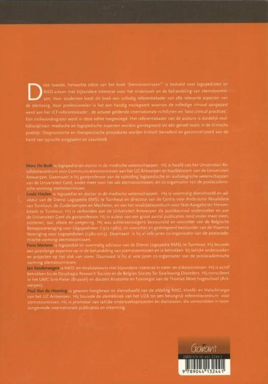 Deze herwerkte editie van het boek ‘Stemstoornissen’ is bedoeld voor logopedisten en NKO-artsen met bijzondere interesse voor het onderzoek en de behandeling van stemstoornissen. Voor studenten biedt dit boek een volledig referentiekader van alle relevante aspecten van de stemzorg. Voor professionelen is het een handig naslagwerk waarvan de volledige inhoud aangepast werd aan het ICF-referentiekader, de actueel geldende internationale richtlijnen en ‘best clinical practices’. Een trefwoordregister werd in deze editie toegevoegd. Het referentiekader van de auteurs is duidelijk multidisciplinair: medische en logopedische aspecten worden geïntegreerd tot één geheel zoals in de klinische praktijk. Diagnostische en therapeutische procedures worden kritisch benaderd en geconcretiseerd aan de hand van typische zorgpaden en casuïstiek.