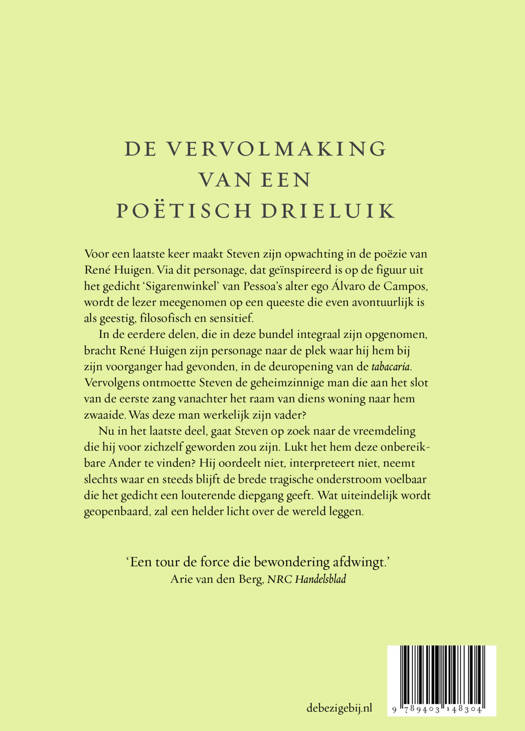 Voor de derde keer maakt Steven zijn opwachting in de poëzie van René Huigen. Via dit personage, geïnspireerd op de figuur uit het gedicht ‘Sigarenwinkel’ van Pessoa’s alter ego Álvaro de Campos, wordt de lezer meegenomen op een queeste die net zo avontuurlijk is als sensitief, geestig en filosofisch. In 2005 verscheen hij voor het eerst ten tonele in het werk van René Huigen. Toen bracht hij Steven naar de plek waar hij hem bij zijn voorganger had gevonden, in de deuropening van de tabacaria. In het tweede canto uit 2013 liet René Huigen hem de geheimzinnige man ontmoeten die aan het slot van de eerste zang vanachter het raam van diens woning naar hem zwaaide. Was deze man werkelijk zijn vader? Nu in het laatste deel, dat samen met de voorafgaande delen in een gebonden editie verschijnt, gaat Steven op zoek naar de vreemdeling die hij voor zichzelf geworden zou zijn. Lukt het hem deze onbereikbare Ander te vinden? Hij oordeelt niet, interpreteert niet, neemt slechts waar en steeds blijft de brede tragische onderstroom voelbaar die het gedicht een louterende diepgang geeft. Wat Steven uiteindelijk wordt geopenbaard zal een helder licht over de wereld leggen.