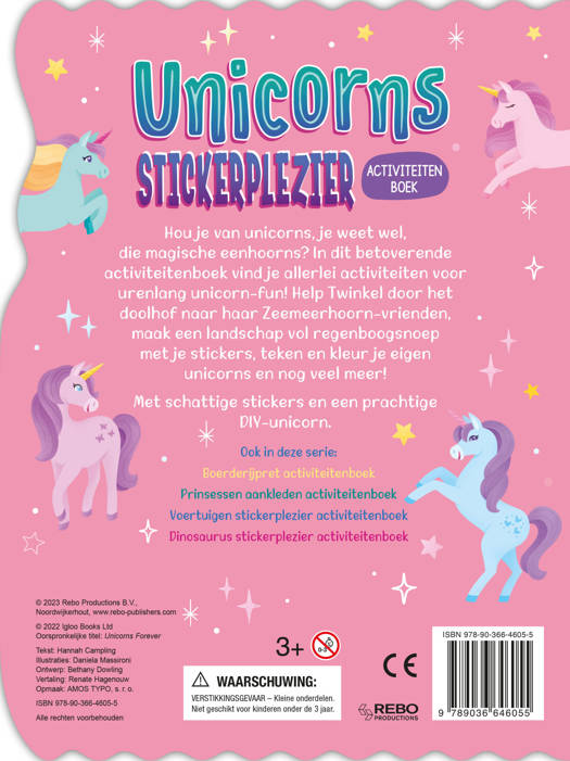 Hou je van unicorns, je weet wel, die magische eenhoorns? In dit betoverende activiteitenboek vind je allerlei activiteiten voor urenlang unicorn-fun! Help Twinkel door het doolhof naar haar Zeemeerhoorn-vrienden, maak een landschap vol regenboogsnoep met je stickers, teken en kleur je eigen unicorns en nog veel meer! Met schattige stickers en een prachtige DIY-unicorn.