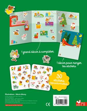 Une pochette constituée de 3 volets qui se déplient pour former un grand décor. 2 planches d'autocollants silicone, repositionnables, épais (environ 30 autocollants.) Thématique : l'atelier du père Noël.